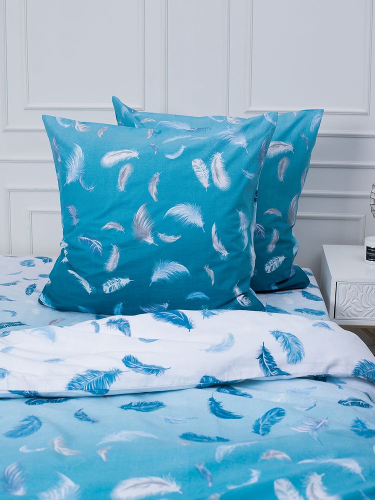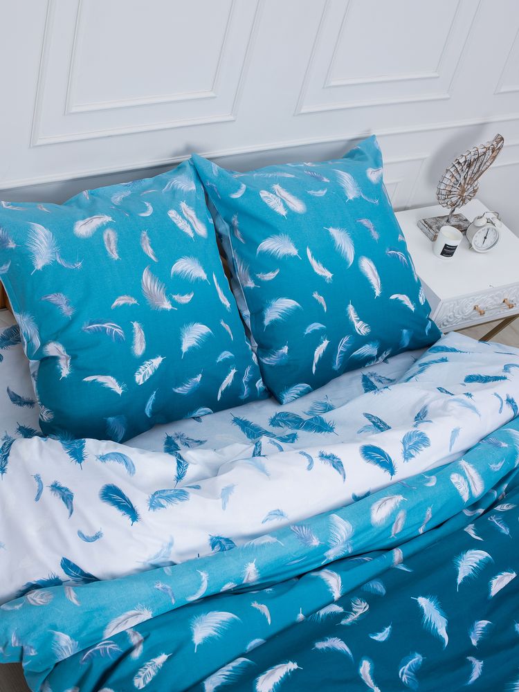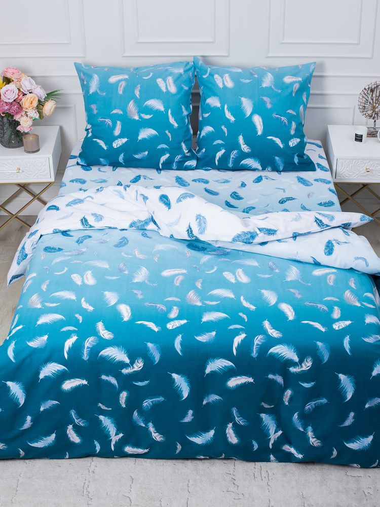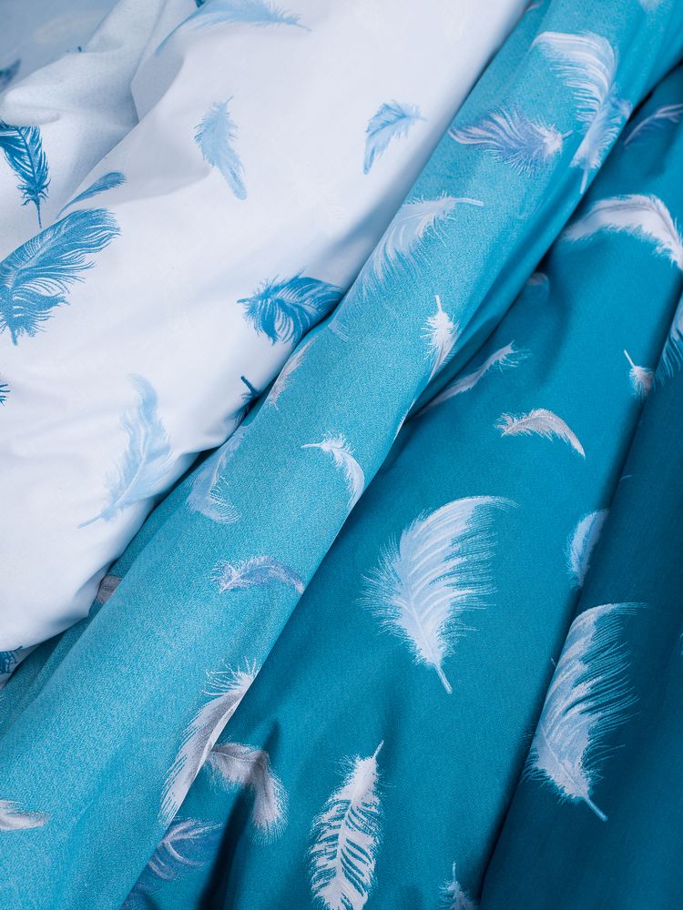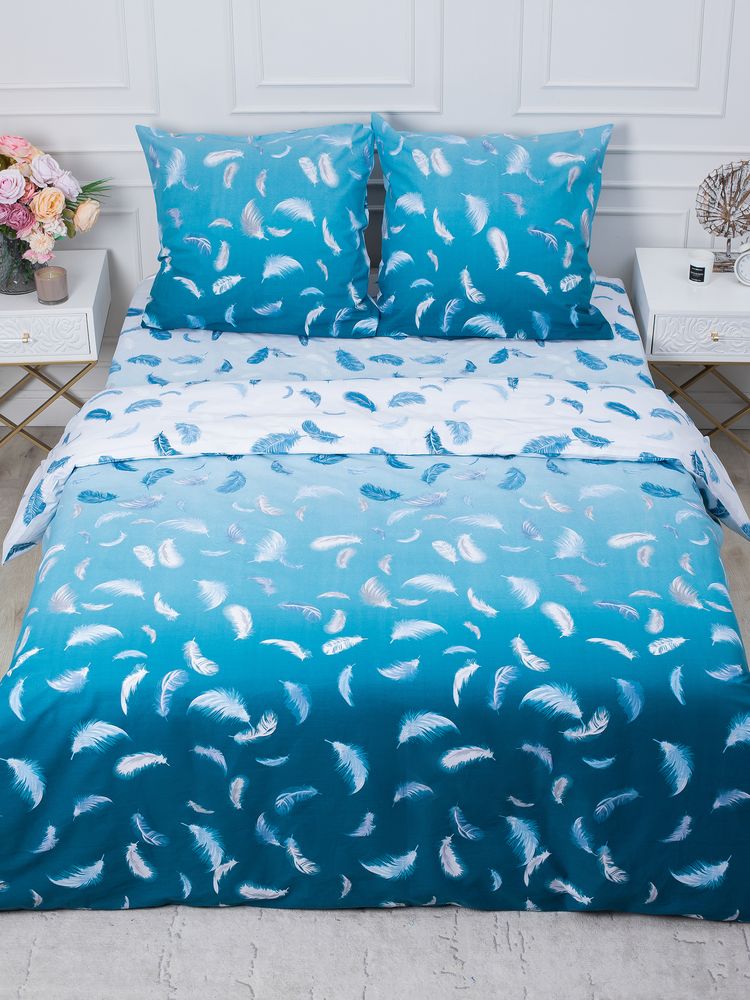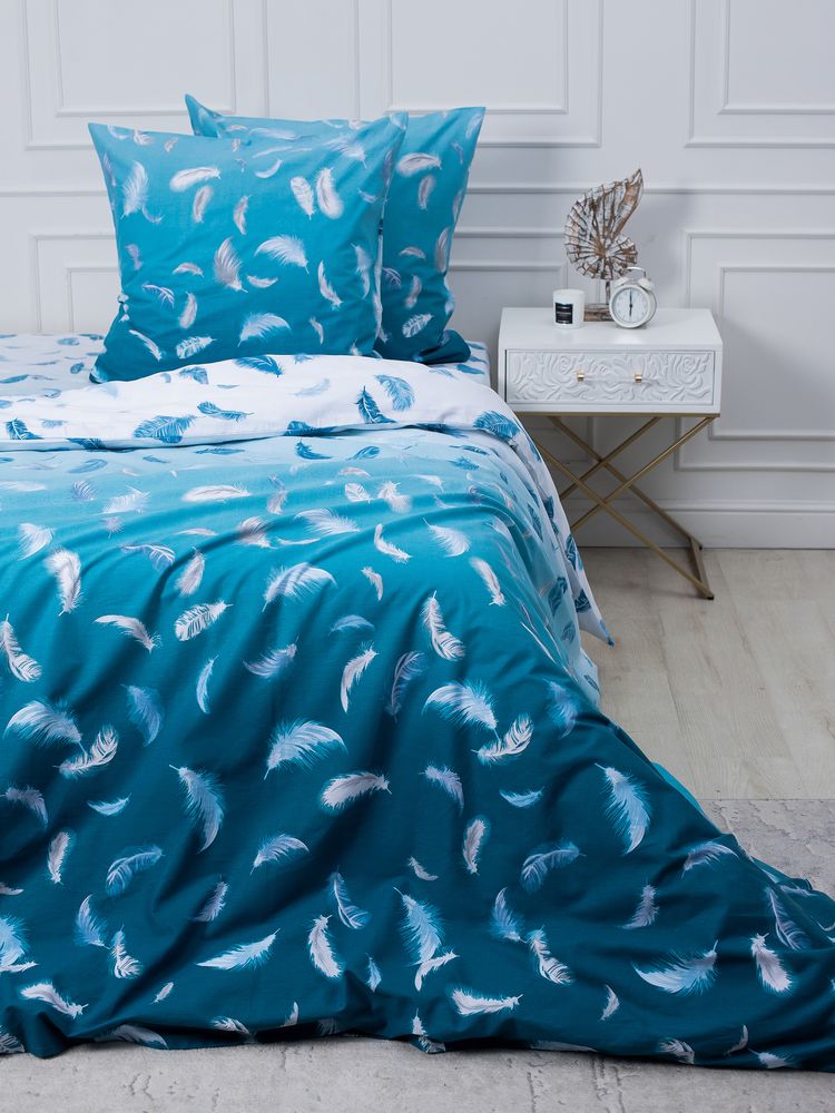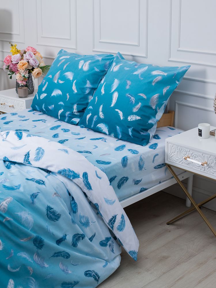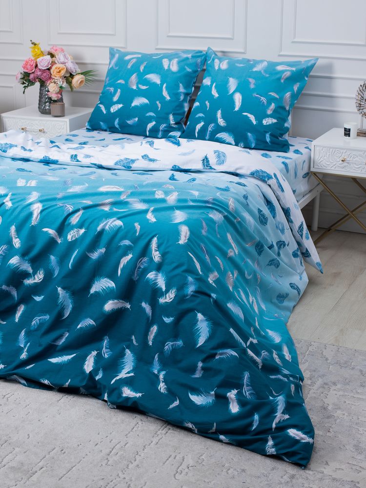 Постельное белье с глубоким, но в тоже время мягким синим переливом, плавно перетекающим друг в друга поможет создать необходимую атмосферу в Вашей спальне, а воздушный и легкий принт в виде перышков подарит ощущение романтики, уюта и поспособствует приятным сновидениям.