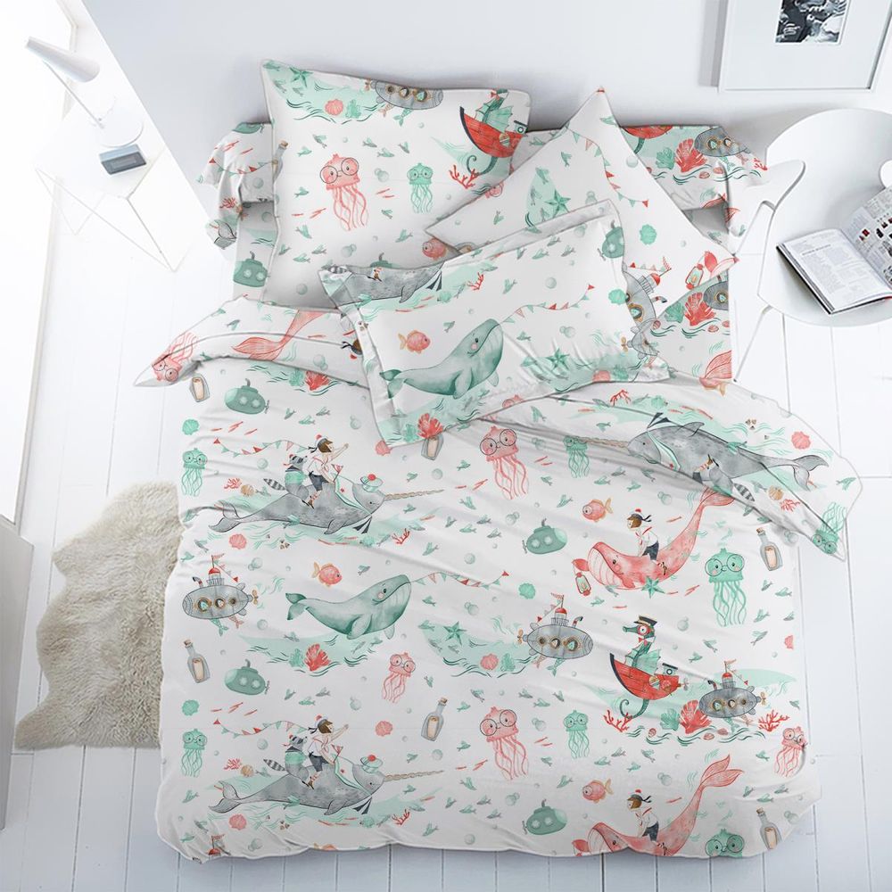 Это очень красивое постельное белье на морскую тему. А какое же море без приключений и записок в бутылках? Мы с вами видим юного капитана, который смело мчится по морю, а вокруг него удивительный подводный мир: осьминоги, кашалоты, кораллы, морские коньки, ракушки и летучие рыбы.