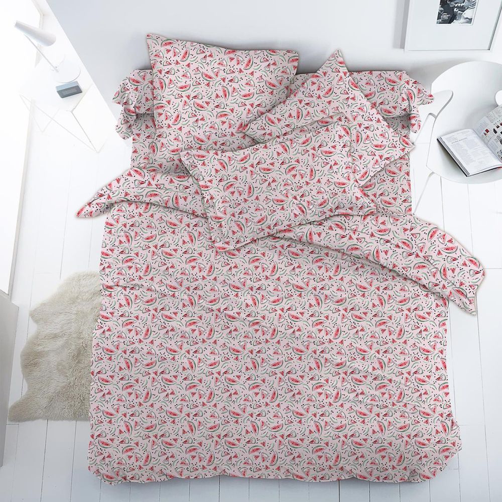 Постельное белье с арбузами на розовом фоне подойдет для вашей девочки. Панно из кусочков арбуза смотрится очень сочно, но абсолютно не навязчиво, а семечки кажутся просто настоящими.