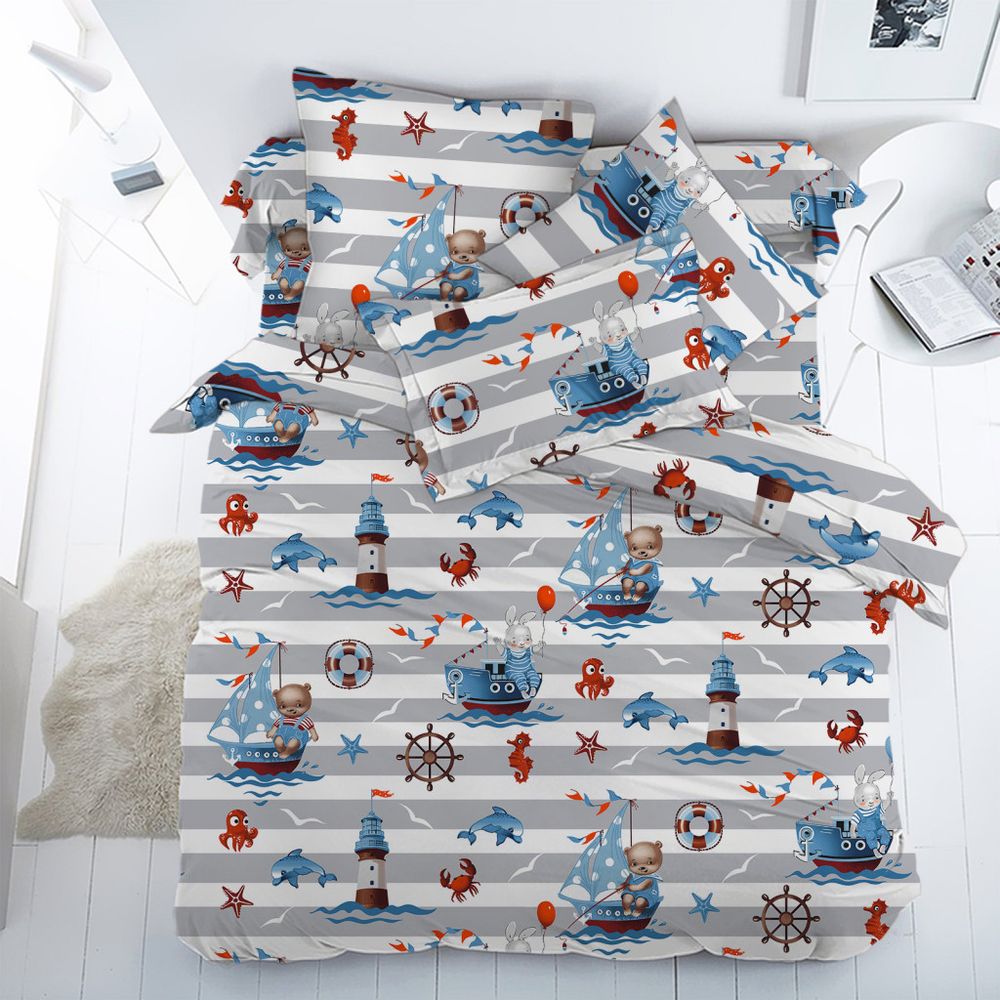 Рыбалка - это постельное белье про море, отдых, хобби, свежий воздух и так далее... Чайки и дельфины, осьминожки и милые маленькие кораблики, маяки и морские звёзды на фоне серо-белой полоски смотрятся очень красиво и празднично!
