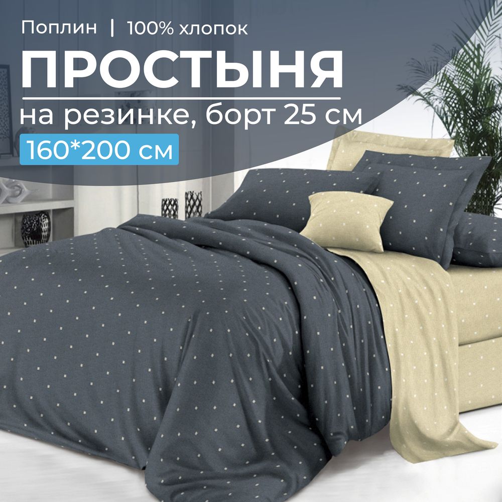 Очень удобная 2-спальная простыня на резинке из поплина плотностью ткани 110 г/м2 на спальное место 160*200 см (ширина и длина матраса). Простыня имеет глубокий борт/спуск 25 см. Резинка проходит по всему периметру (кругу) спального места. Простыня из поплина изготовлена из 100% хлопка, который обладает высоким качеством, что гарантирует Вам долговечность и удобство использования. Хлопковая простыня обеспечит приятную прохладу летом и тепло зимой, благодаря своей дышащей и гипоаллергенной структуре. Кроме того, она легко стирается и сохраняет свою форму и качество даже после многих стирок. Выберите качество и комфорт для своего сна с нашей хлопковой простыней на резинке из поплина!Обратите внимание! Простыни сшиты с учетом усадки ткани (с большим припуском по длине и ширине), поэтому необходима предварительная стирка данного швейного изделия.